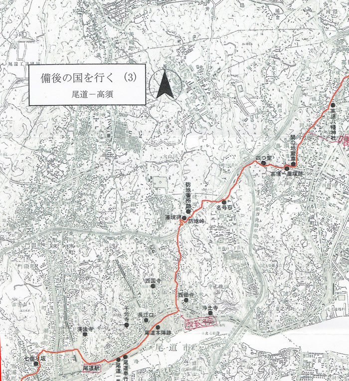JR東尾道駅――大田貝塚跡――高須四つ堂――坊士池(蓮如上人名号石)――防地番所――