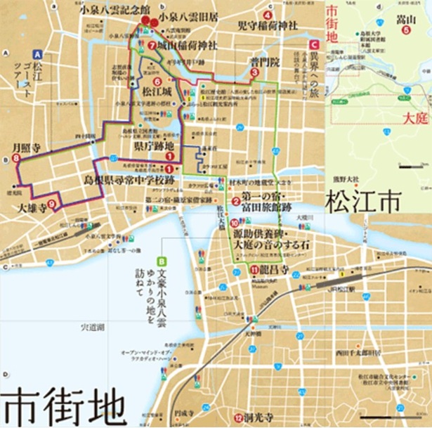 島根県尋常中学校及び県庁跡地:八雲が教えた学舎の跡。