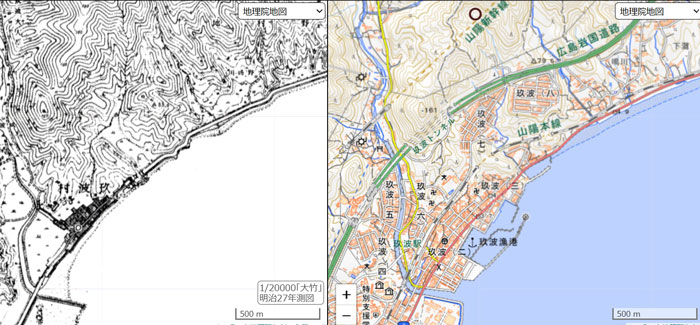 古い地形図(明治27年)と現在の地図を並べて比較