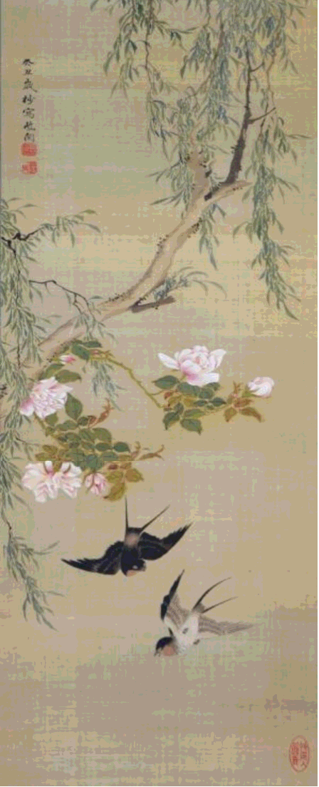 2羽のツバメが中国に由来するコウシンバラと思われるばらと柳の周りを翻る姿が描かれており、