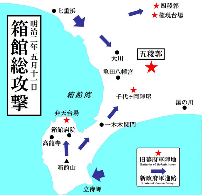 | 同年5月11日 | 福山藩、薩摩藩と共に海路で函館山上陸、奇襲を行う 函館山救援に向かった土方歳三、途中の一本木関門にて討死 |