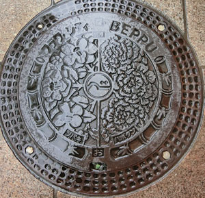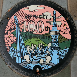 大正13年4月1日に、 人口36,276人の別府市が誕生し、 その後、 昭和10年には、 隣接する石垣村、 朝日村、 亀川町を編入し、 観光温泉地としての今日の別府市の 基盤を確立するに至りました 別府市制100周年記念 デザインマンホール蓋 ソルパセオ銀座駅前通り側入口 |