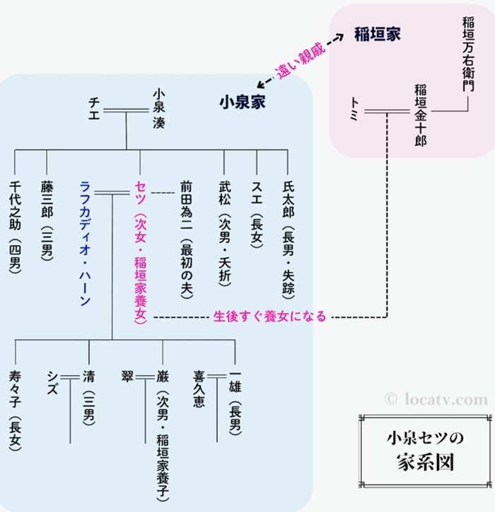 1896年、小泉セツと結婚、日本に帰化し、小泉八雲を名乗る。